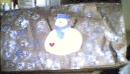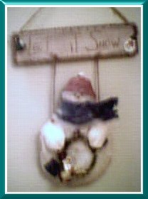 These are the cutest snowmen. They have personality. The little one is made from a tiny clay pot with a ball head and knitted material around for her outfit. All painted white. The big one is made from a milk chug (?) bottle, with knitted material for the hat and scarf. There is holly, snow and birds on the head, shoulder and other areas. His sign reads "Will Work For Freezer Space". The base is a birdnest. |